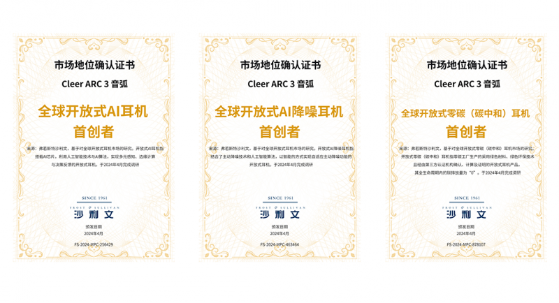 The technological innovation and environmental protection concept of Cleer ARC 3 sound arc have also been certified by the international authoritative organization Sullivan, and have obtained multiple honorary certificates such as "Global Open AI Noise cancelling Earphone Pioneer", "Global Open Zero Carbon (Carbon Neutral) Earphone Pioneer", and "Global Open AI Earphone Pioneer". These certifications not only highly recognize Cleer's product innovation, but also further establish Cleer's leading position in the international acoustics field.