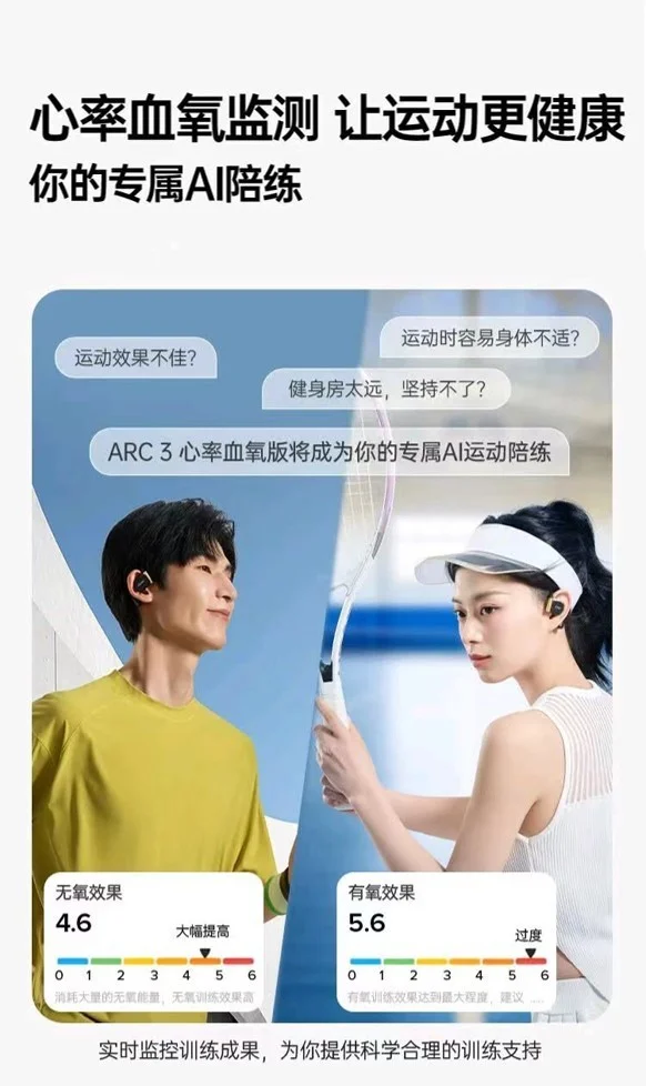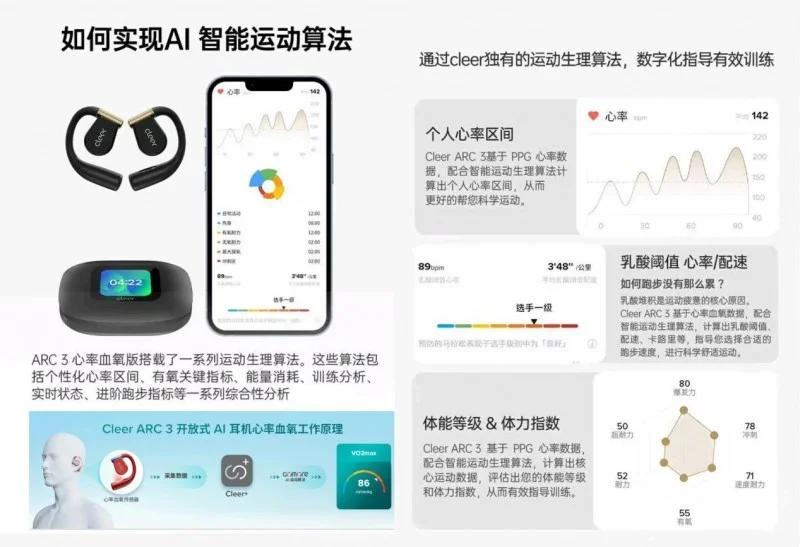 Among the popular wearable devices on the market, heart rate and blood oxygen monitoring, a crucial function for fitness enthusiasts, is mostly achieved through wrist devices such as fitness bracelets and watches. However, research has shown that compared to the wrist, the ear, as the second most densely populated area of capillaries in the human body after fingertips, has a unique physiological structure that provides excellent conditions for optical measurement technology. Therefore, the PPG signal quality obtained from headphones is higher, and the accuracy of heart rate and blood oxygen monitoring will also be higher. In other words, headphones are more suitable for monitoring heart rate and blood oxygen than wristbands. The highly anticipated Cleer ARC 3 Sound Arc Open AI Earphones Sport Pro is the first time in the world that heart rate and blood oxygen monitoring functions have been implemented in open AI headphones, bringing unprecedented surprises to users, especially fitness enthusiasts.