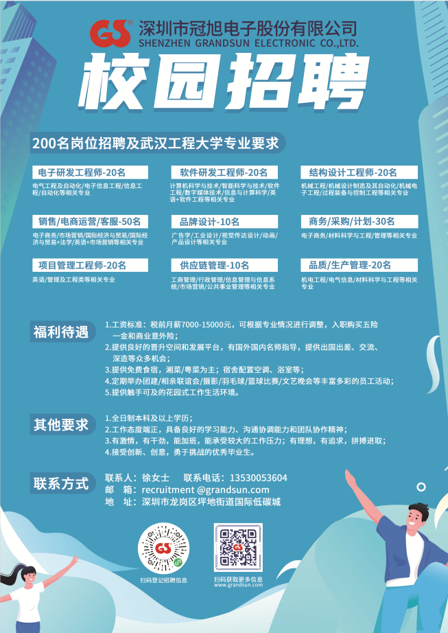 冠旭電子公布了參加武漢工程大學(xué)2021春季校園招聘公告,本次招聘包含眾多職位,覆蓋了從研發(fā)、設(shè)計(jì)、品牌、管理、商務(wù)、銷售等領(lǐng)域,共200個職位。
