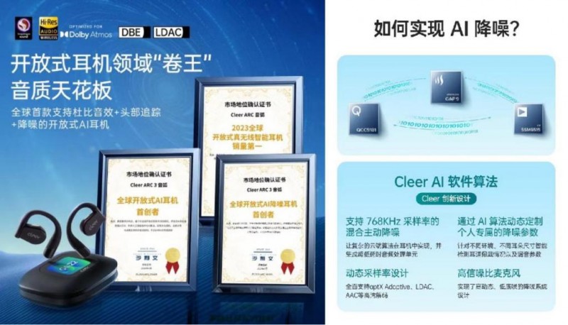此外,Cleer ARC 3 音弧的“新”,“新”在AI。與傳統(tǒng)耳機不同的是,Cleer ARC 3 音弧是全球首款開放式AI耳機。這意味著它除了具備除了“大師音質(zhì)”外,還擁有著令人驚喜的AI語音控制、AI體感操控、AI聲境恒聽等六大AI功能。