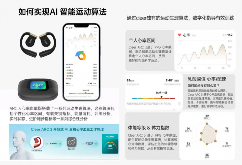 更重要的是Cleer ARC 3 音弧聯(lián)合全球頂尖專業(yè)運(yùn)動(dòng)科學(xué)及AI智能教練服務(wù)商GoMore,結(jié)合AI芯片與專業(yè)智能運(yùn)動(dòng)算法實(shí)現(xiàn)了精確的健康數(shù)據(jù)監(jiān)測(cè)功能。這款耳機(jī)不僅能檢測(cè)常規(guī)的心率和血氧數(shù)據(jù),還能通過(guò)觸地時(shí)間、步伐對(duì)稱性等高階指標(biāo),分析并糾正跑步姿態(tài),降低運(yùn)動(dòng)受傷的風(fēng)險(xiǎn)。此外,它還能實(shí)時(shí)監(jiān)測(cè)運(yùn)動(dòng)負(fù)荷,計(jì)算熱量消耗,并根據(jù)個(gè)體身體狀態(tài)評(píng)估體力值恢復(fù)時(shí)間,為用戶提供科學(xué)、全面的運(yùn)動(dòng)數(shù)據(jù)參考。過(guò)年吃喝不怕胖,有了它,隨時(shí)掌握身體狀態(tài),健康管理全方位Max!